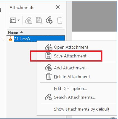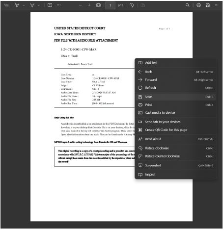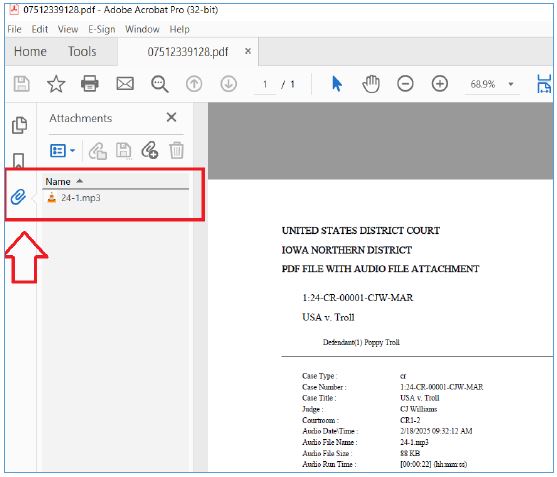 Audio from public court hearings may be accessible on the public court docket. The MP3 audio file is attached inside the PDF file on the docket. The PDF on the docket must be downloaded and opened locally (ideally in Adobe Acrobat or Adobe Reader). 1. Log into CM/ECF through PACER 2. Open the docket sheet for the applicable case 3. Find the entry you are trying to access. Click on the docket number hyperlink to open the PDF document 4. Right click on the PDF document and save it to your computer 5. You can now minimize the CM/ECF window 6. Open the saved PDF document on your computer using Adobe Reader or Adobe Acrobat 7. Click the paperclip to view the attachments in the PDF 8. Right-click the attachment and select Save As. Save the file to a convenient location 9. Access and open the audio file